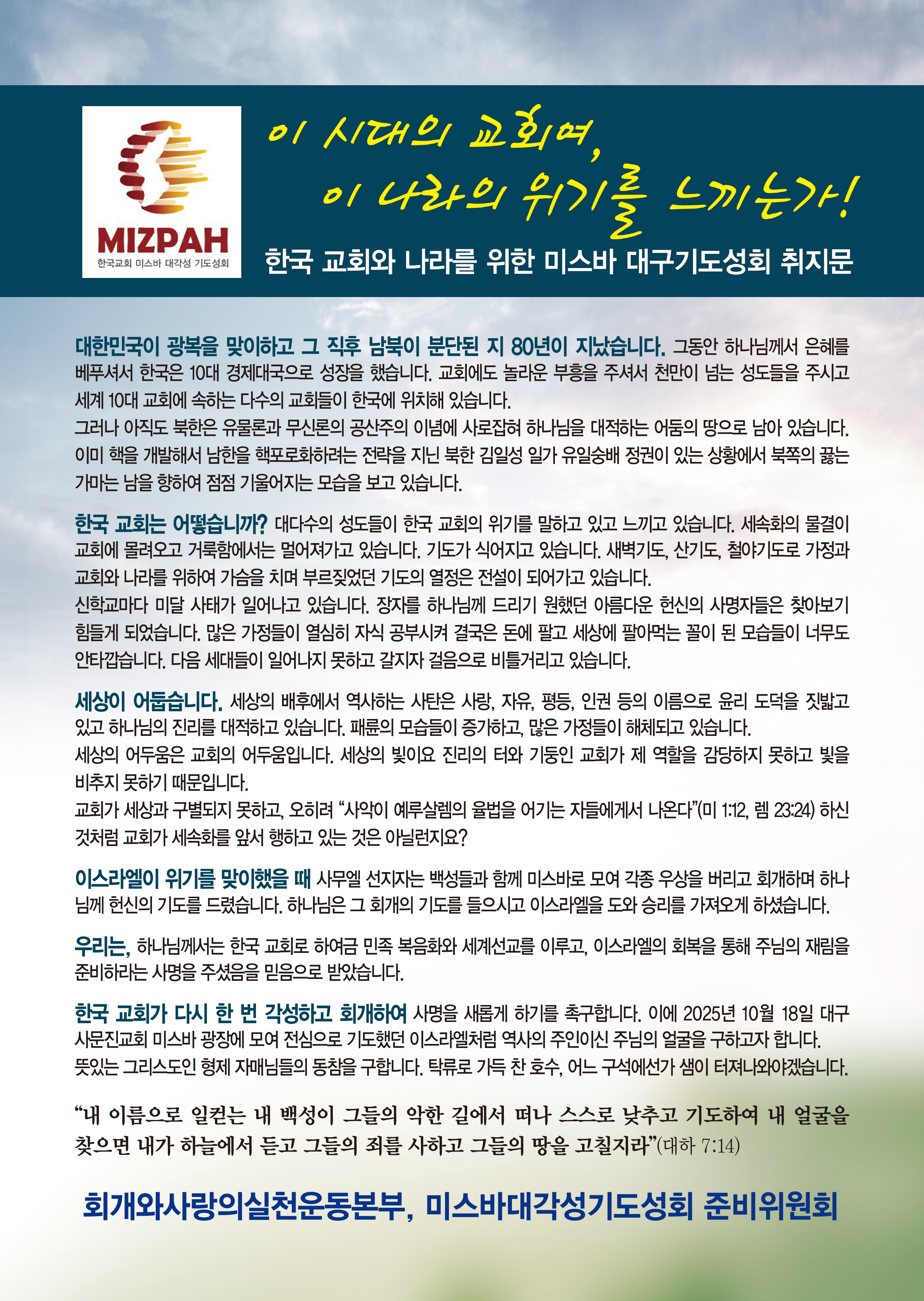 ÀÌ ½Ã´ëÀÇ ±³È¸¿©, ÀÌ ³ª¶óÀÇ À§±â¸¦ ´À³¢´Â°¡ Çѱ¹ ±³È¸¿Í ³ª¶ó¸¦ À§ÇÑ ¹Ì½º¹Ù ´ë±¸±âµµ¼ºÈ¸ ÃëÁö¹® ´ëÇѹα¹ÀÌ ±¤º¹À» ¸ÂÀÌÇÏ°í ±× Á÷ÈÄ ³²ºÏÀÌ ºÐ´ÜµÈ Áö 80³âÀÌ Áö³µ½À´Ï´Ù. ±×µ¿¾È Çϳª´Ô²²¼ ÀºÇý¸¦ º£Çª¼Å¼ Çѱ¹Àº 10´ë °æÁ¦´ë±¹À¸·Î ¼ºÀåÀ» Çß½À´Ï´Ù. ±³È¸¿¡µµ ³î¶ó¿î ºÎÈïÀ» Áּż õ¸¸ÀÌ ³Ñ´Â ¼ºµµµéÀ» ÁÖ½Ã°í ¼¼°è 10´ë ±³È¸¿¡ ¼ÓÇÏ´Â ´Ù¼öÀÇ ±³È¸µéÀÌ Çѱ¹¿¡ À§Ä¡ÇØ ÀÖ½À´Ï´Ù. ±×·¯³ª ¾ÆÁ÷µµ ºÏÇÑÀº À¯¹°·Ð°ú ¹«½Å·ÐÀÇ °ø»êÁÖÀÇ À̳信 »ç·ÎÀâÇô Çϳª´ÔÀ» ´ëÀûÇÏ´Â ¾îµÒÀÇ ¶¥À¸·Î ³²¾Æ ÀÖ½À´Ï´Ù. ÀÌ¹Ì ÇÙÀ» °³¹ßÇØ¼ ³²ÇÑÀ» ÇÙÆ÷·ÎÈÇÏ·Á´Â Àü·«À» Áö´Ñ ºÏÇÑ ±èÀϼº Àϰ¡ À¯Àϼþ¹è Á¤±ÇÀÌ ÀÖ´Â »óȲ¿¡¼ ºÏÂÊÀÇ ²ú´Â °¡¸¶´Â ³²À» ÇâÇÏ¿© Á¡Á¡ ±â¿ï¾îÁö´Â ¸ð½ÀÀ» º¸°í ÀÖ½À´Ï´Ù. Çѱ¹ ±³È¸´Â ¾î¶»½À´Ï±î? ´ë´Ù¼öÀÇ ¼ºµµµéÀÌ Çѱ¹ ±³È¸ÀÇ À§±â¸¦ ¸»Çϰí ÀÖ°í ´À³¢°í ÀÖ½À´Ï´Ù. ¼¼¼ÓÈÀÇ ¹°°áÀÌ ±³È¸¿¡ ¸ô·Á¿À°í °Å·èÇÔ¿¡¼´Â ¸Ö¾îÁ®°¡°í ÀÖ½À´Ï´Ù. ±âµµ°¡ ½Ä¾îÁö°í ÀÖ½À´Ï´Ù. »õº®±âµµ, »ê±âµµ, ö¾ß±âµµ·Î °¡Á¤°ú ±³È¸¿Í ³ª¶ó¸¦ À§ÇÏ¿© °¡½¿À» Ä¡¸ç ºÎ¸£Â¢¾ú´ø ±âµµÀÇ ¿Á¤Àº Àü¼³ÀÌ µÇ¾î°¡°í ÀÖ½À´Ï´Ù. ½ÅÇб³¸¶´Ù ¹Ì´Þ »çŰ¡ ÀϾ°í ÀÖ½À´Ï´Ù. ÀåÀÚ¸¦ Çϳª´Ô²² µå¸®±â ¿øÇß´ø ¾Æ¸§´Ù¿î Çå½ÅÀÇ »ç¸íÀÚµéÀº ã¾Æº¸±â Èûµé°Ô µÇ¾ú½À´Ï´Ù. ¸¹Àº °¡Á¤µéÀÌ ¿½ÉÈ÷ ÀÚ½Ä °øºÎ½ÃÄÑ °á±¹Àº µ·¿¡ ÆÈ°í ¼¼»ó¿¡ ÆÈ¾Æ¸Ô´Â ²ÃÀÌ µÈ ¸ð½ÀµéÀÌ ³Ê¹«µµ ¾ÈŸ±õ½À´Ï´Ù. ´ÙÀ½ ¼¼´ëµéÀÌ ÀϾÁö ¸øÇÏ°í °¥ÁöÀÚ °ÉÀ½À¸·Î ºñƲ°Å¸®°í ÀÖ½À´Ï´Ù. ¼¼»óÀÌ ¾îµÓ½À´Ï´Ù. ¼¼»óÀÇ ¹èÈÄ¿¡¼ ¿ª»çÇÏ´Â »çźÀº »ç¶û, ÀÚÀ¯, Æòµî, À뱂 µîÀÇ À̸§À¸·Î À±¸® µµ´öÀ» Áþ¹â°í ÀÖ°í Çϳª´ÔÀÇ Áø¸®¸¦ ´ëÀûÇϰí ÀÖ½À´Ï´Ù. ÆÐ·ûÀÇ ¸ð½ÀµéÀÌ Áõ°¡Çϰí, ¸¹Àº °¡Á¤µéÀÌ ÇØÃ¼µÇ°í ÀÖ½À´Ï´Ù. ¼¼»óÀÇ ¾îµÎ¿òÀº ±³È¸ÀÇ ¾îµÎ¿òÀÔ´Ï´Ù. ¼¼»óÀÇ ºûÀÌ¿ä Áø¸®ÀÇ ÅÍ¿Í ±âµÕÀÎ ±³È¸°¡ Á¦ ¿ªÇÒÀ» °¨´çÇÏÁö ¸øÇÏ°í ºûÀ» ºñÃßÁö ¸øÇϱ⠶§¹®ÀÔ´Ï´Ù. ±³È¸°¡ ¼¼»ó°ú ±¸º°µÇÁö ¸øÇϰí, ¿ÀÈ÷·Á ¡°»ç¾ÇÀÌ ¿¹·ç»ì·½ÀÇ À²¹ýÀ» ¾î±â´Â Àڵ鿡°Ô¼ ³ª¿Â´Ù¡±(¹Ì 1:12, ·½ 23:24) ÇϽаÍó·³ ±³È¸°¡ ¼¼¼Óȸ¦ ¾Õ¼ ÇàÇϰí ÀÖ´Â °ÍÀº ¾Æ´Ò·±Áö¿ä? À̽º¶ó¿¤ÀÌ À§±â¸¦ ¸ÂÀÌÇßÀ» ¶§ »ç¹«¿¤ ¼±ÁöÀÚ´Â ¹é¼ºµé°ú ÇÔ²² ¹Ì½º¹Ù·Î ¸ð¿© °¢Á¾ ¿ì»óÀ» ¹ö¸®°í ȸ°³Çϸç Çϳª´Ô²² Çå½ÅÀÇ ±âµµ¸¦ µå·È½À´Ï´Ù. Çϳª´ÔÀº ±× ȸ°³ÀÇ ±âµµ¸¦ µéÀ¸½Ã°í À̽º¶ó¿¤À» µµ¿Í ½Â¸®¸¦ °¡Á®¿À°Ô Çϼ̽À´Ï´Ù. ¿ì¸®´Â, Çϳª´Ô²²¼´Â Çѱ¹ ±³È¸·Î ÇÏ¿©±Ý ¹ÎÁ· º¹À½È¿Í ¼¼°è¼±±³¸¦ ÀÌ·ç°í, À̽º¶ó¿¤ÀÇ È¸º¹À» ÅëÇØ ÁÖ´ÔÀÇ À縲À» ÁغñÇ϶ó´Â »ç¸íÀ» ÁÖ¼ÌÀ½À» ¹ÏÀ½À¸·Î ¹Þ¾Ò½À´Ï´Ù. Çѱ¹ ±³È¸°¡ ´Ù½Ã ÇÑ ¹ø °¢¼ºÇϰí ȸ°³ÇÏ¿© »ç¸íÀ» »õ·Ó°Ô Çϱ⸦ Ã˱¸ÇÕ´Ï´Ù. ÀÌ¿¡ 2025³â 10¿ù 18ÀÏ ´ë±¸ »ç¹®Áø±³È¸ ¹Ì½º¹Ù ±¤Àå¿¡ ¸ð¿© Àü½ÉÀ¸·Î ±âµµÇß´ø À̽º¶ó¿¤Ã³·³ ¿ª»çÀÇ ÁÖÀÎÀ̽ŠÁÖ´ÔÀÇ ¾ó±¼À» ±¸ÇϰíÀÚ ÇÕ´Ï´Ù. ¶æÀÖ´Â ±×¸®½ºµµÀÎ ÇüÁ¦ ÀڸŴԵéÀÇ µ¿ÂüÀ» ±¸ÇÕ´Ï´Ù. Ź·ù·Î °¡µæ Âù È£¼ö, ¾î´À ±¸¼®¿¡¼±°¡ »ùÀÌ ÅÍÁ®³ª¿Í¾ß°Ú½À´Ï´Ù. ¡°³» À̸§À¸·Î ÀÏÄ´ ³» ¹é¼ºÀÌ ±×µéÀÇ ¾ÇÇÑ ±æ¿¡¼ ¶°³ª ½º½º·Î ³·Ãß°í ±âµµÇÏ¿© ³» ¾ó±¼À» ãÀ¸¸é ³»°¡ Çϴÿ¡¼ µè°í ±×µéÀÇ Á˸¦ »çÇÏ°í ±×µéÀÇ ¶¥À» °íÄ¥Áö¶ó¡±(´ëÇÏ 7:14) ȸ°³¿Í»ç¶ûÀǽÇõ¿îµ¿º»ºÎ, ¹Ì½º¹Ù´ë±¸±âµµ¼ºÈ¸ ÁغñÀ§¿øÈ¸ |